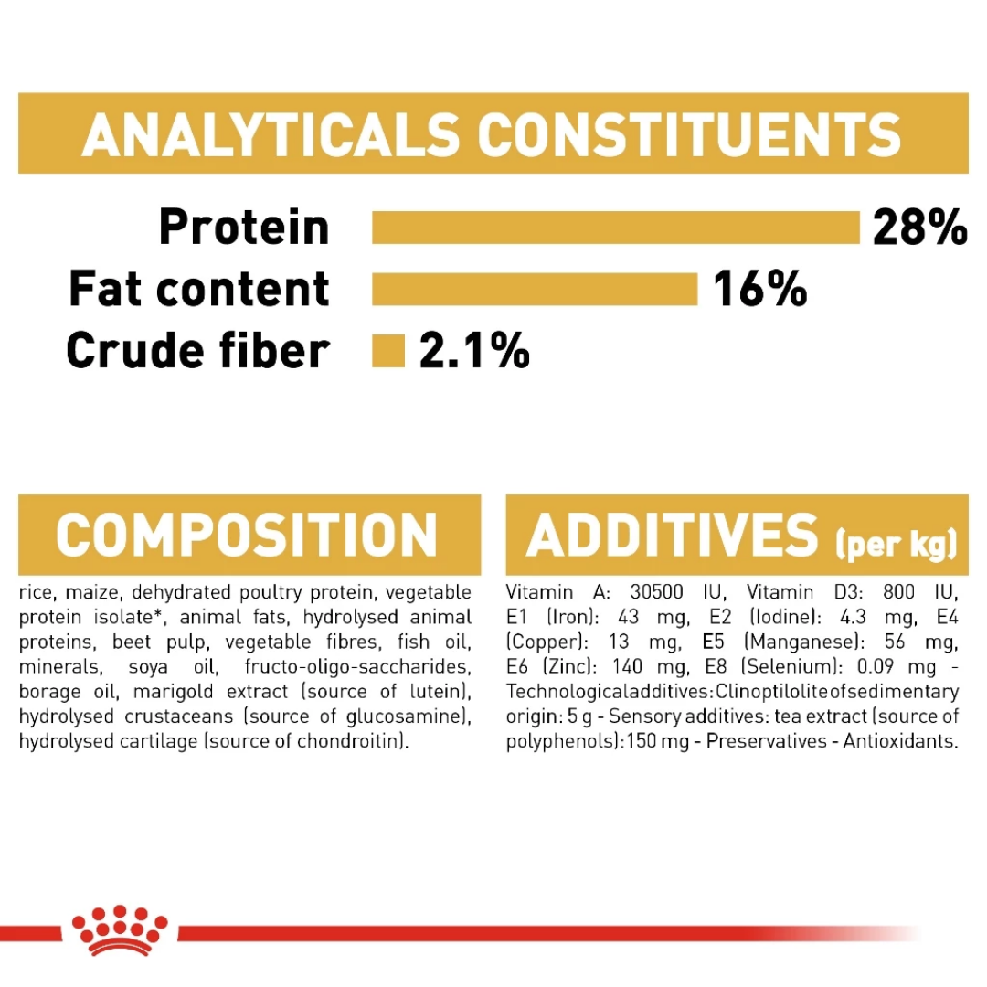 Rice, maize, dehydrated poultry protein, vegetable protein isolate*, animal fats, hydrolysed animal proteins, beet pulp, vegetable fibres, fish oil, minerals, soya oil, fructo-oligo-saccharides, borage oil, marigold extract (source of lutein), hydrolysed crustaceans (source of glucosamine), hydrolysed cartilage (source of chondroitin).